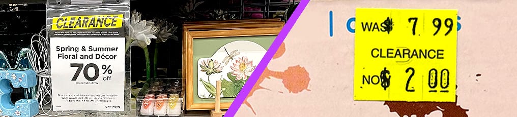 ✅ Know The Clearance Codes: Seasonal clearance is marked with big 70% off signs. Everyday products that receive colorful sticker tags have already hit their lowest price and will only go cheaper if they are added to the ten dollar mystery boxes that you’ll see at very end of a store clearance cycle.
