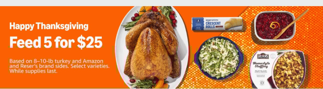 🦃 NEW Thanksgiving Meal Deal for $25: For anyone in an area with access to Amazon Fresh Grocery Delivery, an 8 Pound Butterball Turkey and enough sides to feed five people will cost you just $25 right now.