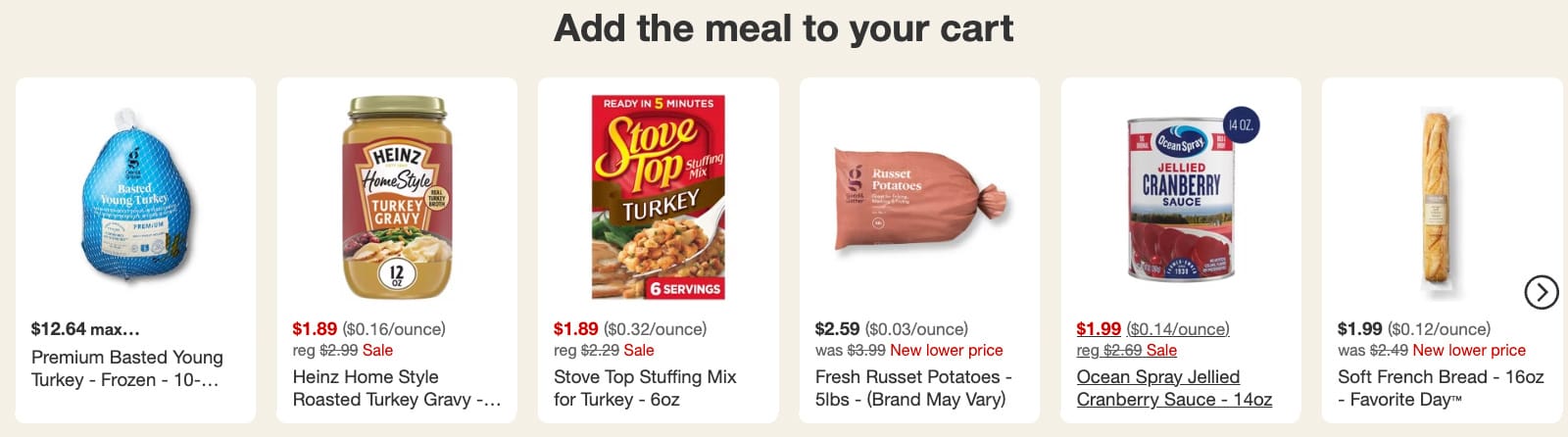 If you’re planning to feed a smaller amount of people, Target has just announced its own dinner bundle priced under $20, that includes turkey, sides and pie ingredients. (scroll to the middle of the page)